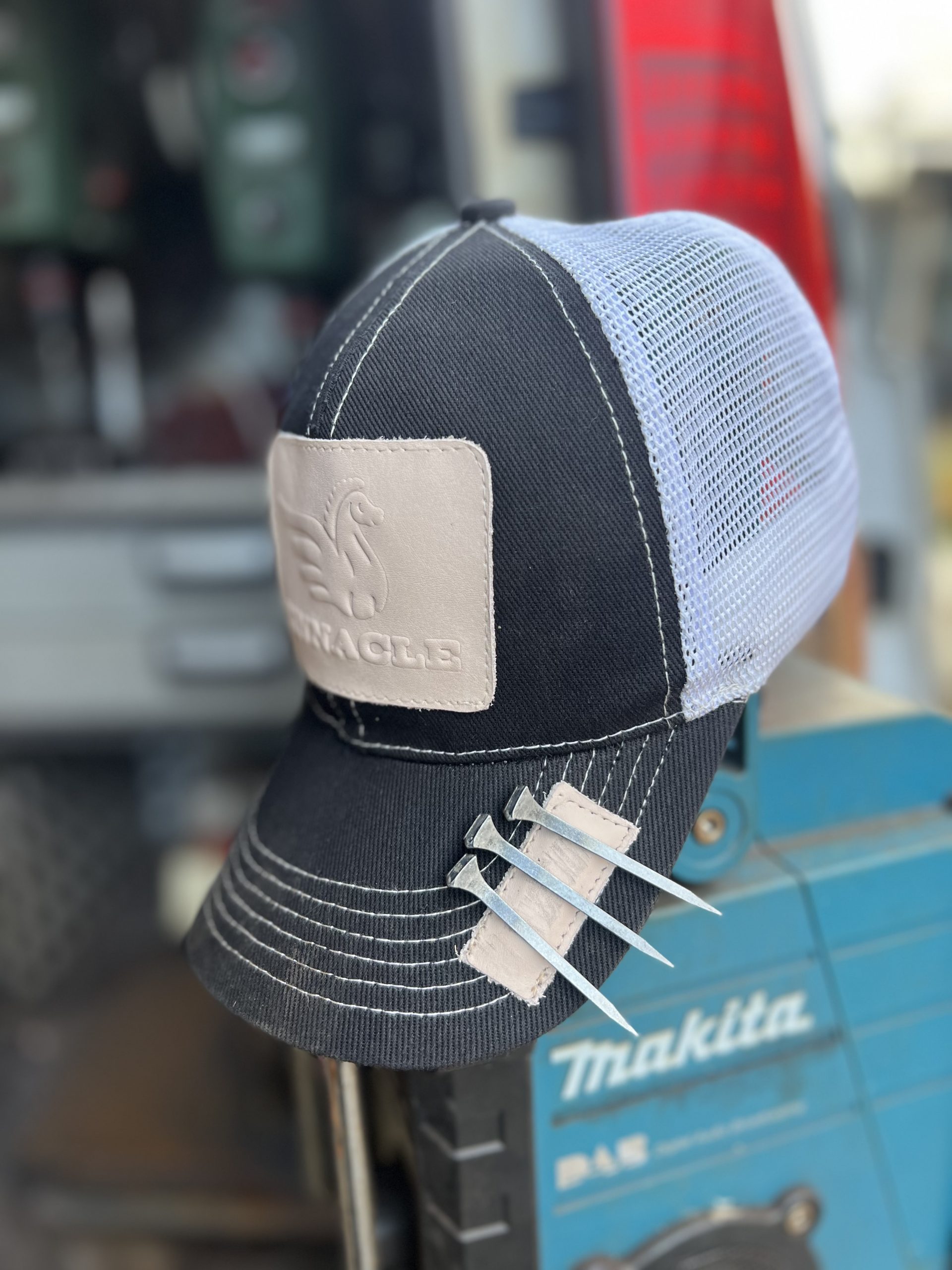 leather magnet patch on peak of cap